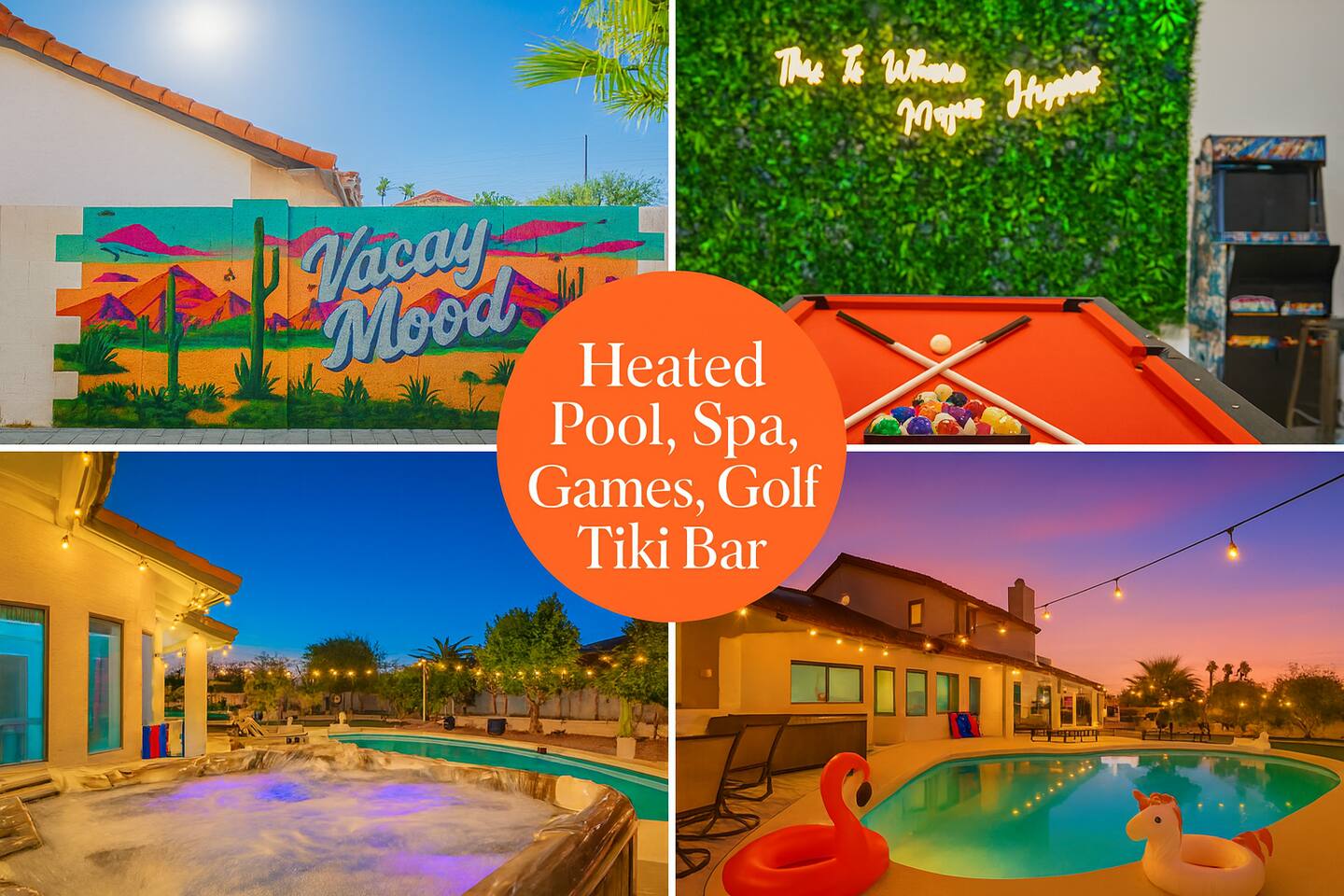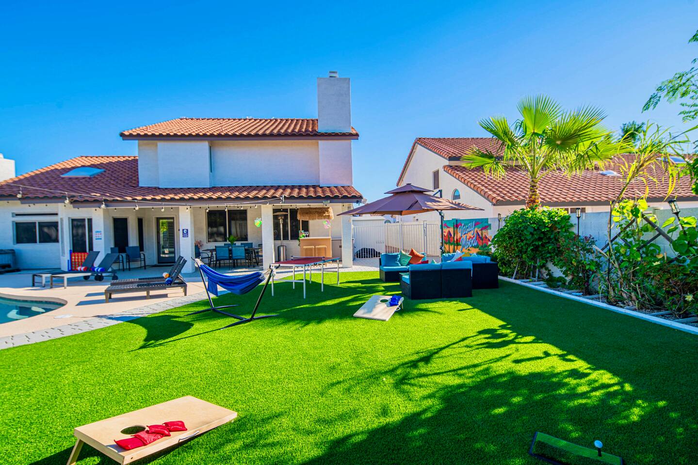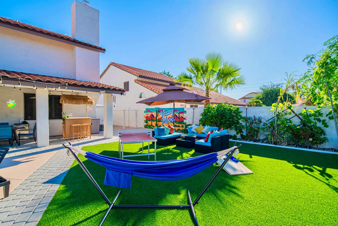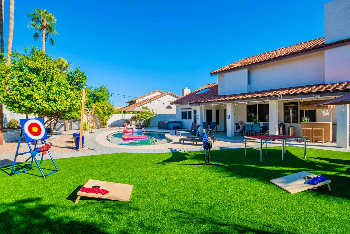 Welcome to your Scottsdale Resort Vibes Retreat — where relaxation meets fun! This luxury family- and group-friendly escape blends comfort, entertainment, and Scottsdale flair. Whether you're planning a family getaway, bachelorette weekend, or golf trip, this home delivers resort-style living in one of Scottsdale’s best neighborhoods. Highlights: Heated Pool, Hot Tub, Tiki Bar, Photo ready wall(s), Golf hitting range, Massage Chair, baby high chair, bath tub and Plenty of games.