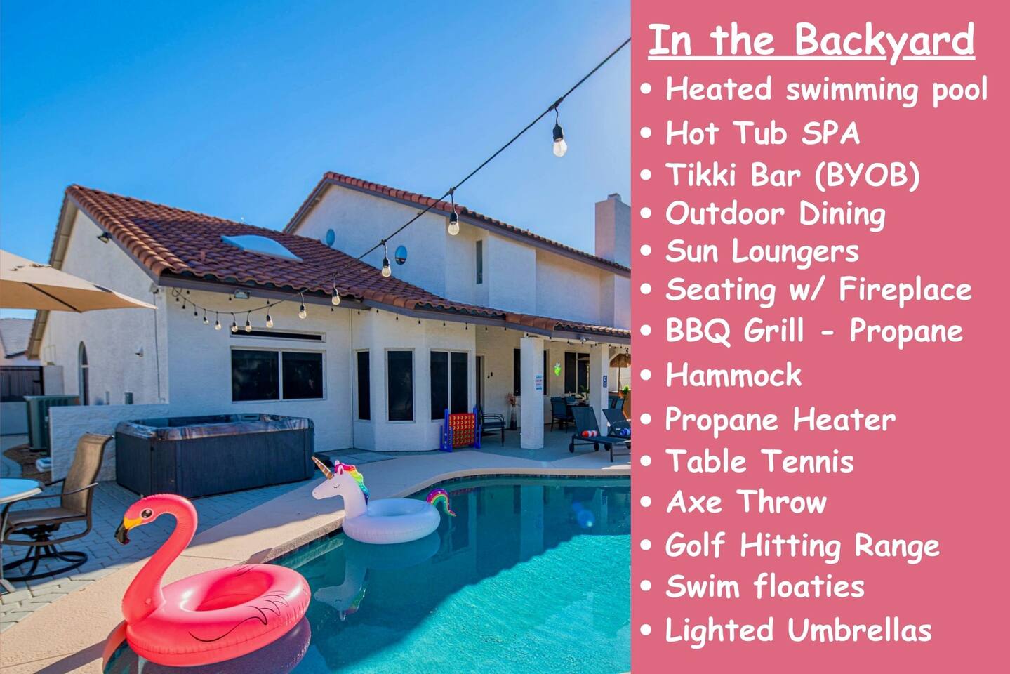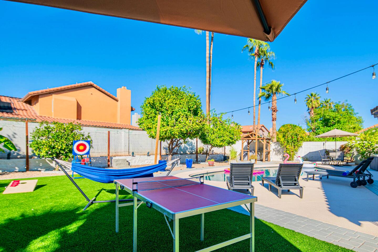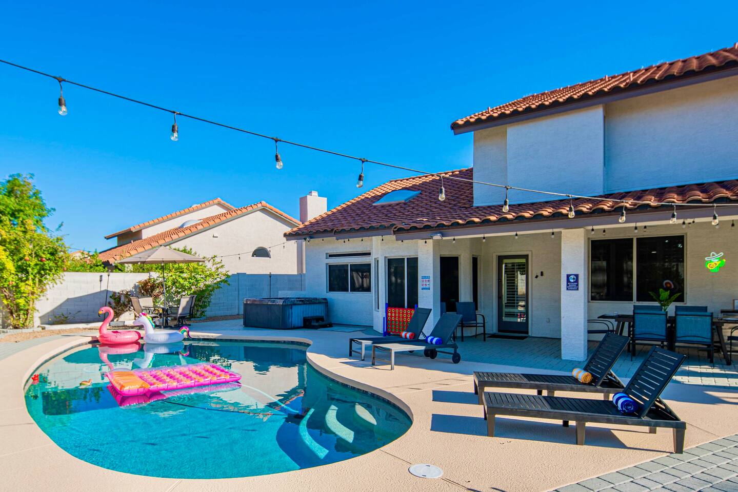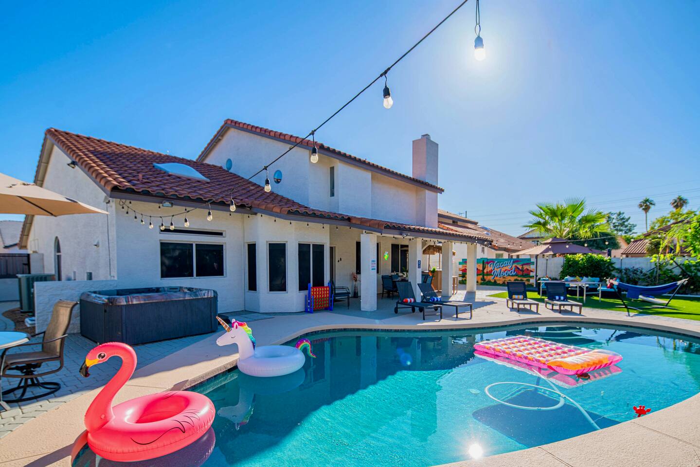 Welcome to your Scottsdale Resort Vibes Retreat — where relaxation meets fun! This luxury family- and group-friendly escape blends comfort, entertainment, and Scottsdale flair. Whether you're planning a family getaway, bachelorette weekend, or golf trip, this home delivers resort-style living in one of Scottsdale’s best neighborhoods. Highlights: Heated Pool, Hot Tub, Tiki Bar, Photo ready wall(s), Golf hitting range, Massage Chair, baby high chair, bath tub and Plenty of games.